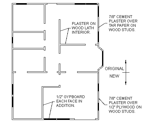 In this plan, a 1950's style home is expanded by adding a strip of building to the rear. The original construction was cement plaster over tar paper on the exterior and wood lath and plaster on the interior. The new portion is cement plaster over plywood on the exterior with gypboard on the interior. The original double sliding door and kitchen window will be removed to create pass-throughs between the buildings. The roof will be disassembled and a new ridge extended to make one roof.