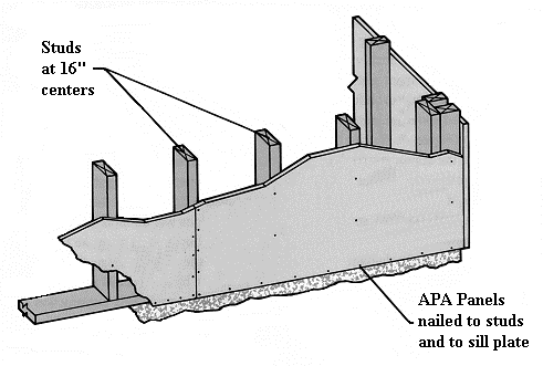 Installing structural wood panels to create shear walls is the best known way to strengthen wood frame buildings. A shear wall is more than the sum of its parts. Its a system - a single unit that ties together the floor, roof, walls and foundation to give a building greater resistance to lateral loads. Professional engineering may be required to design shear walls for some houses. In most cases however, nominal nailing schedules recommended by APA for panel-to-framing connections will provide adequate shear resistance (Figure C).