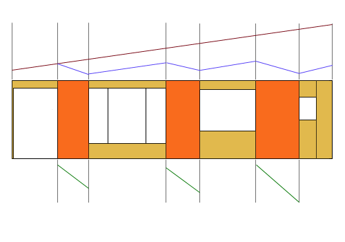 All other sheathing is tan. The total building length is 45 feet. The walls are, from left to right, 4 feet, 5 feet and 6 feet long. The window regions, from left to right are 6 feet, 12 feet, 8 feet and two feet with a 2 foot long segment of wall at the right. The total shear force in this wall line is 4500 pounds. |